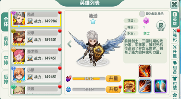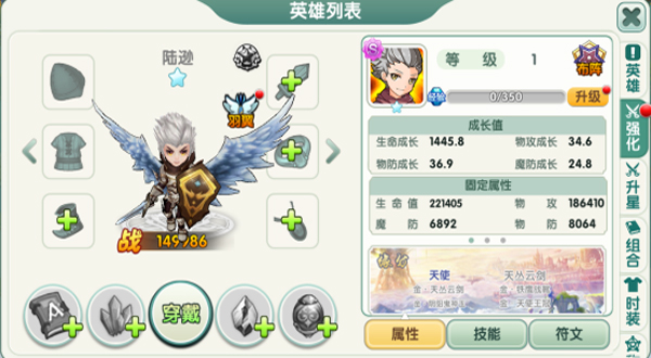 我们可以对英雄进行升级、晋升、穿戴装备、升星,提升技能等级、符文镶嵌培养