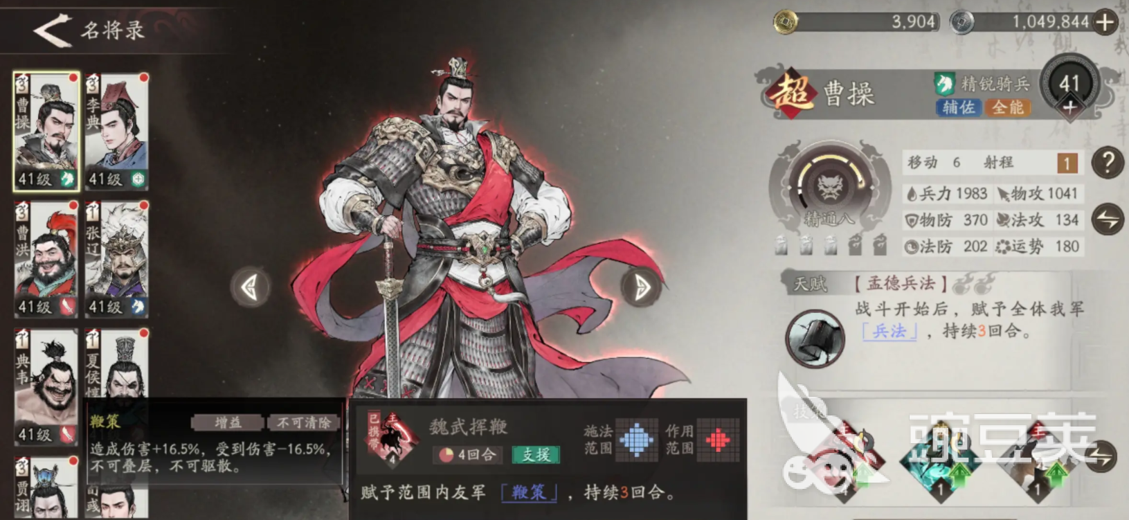 曹操的副将搭配,推荐优先考虑加兵力的。主线很多关卡都卡着 “曹操不死” 的条件,保住他的命是首要目标,所以生存向的副将,比如副将曹纯提供受到普通攻击的伤害降低12%。