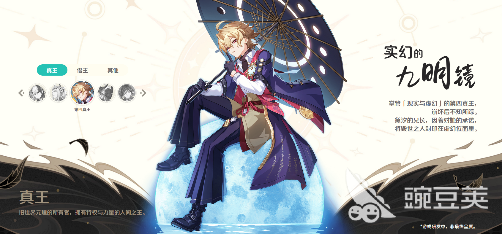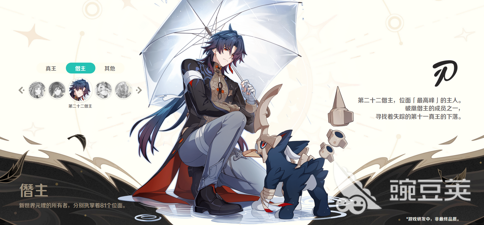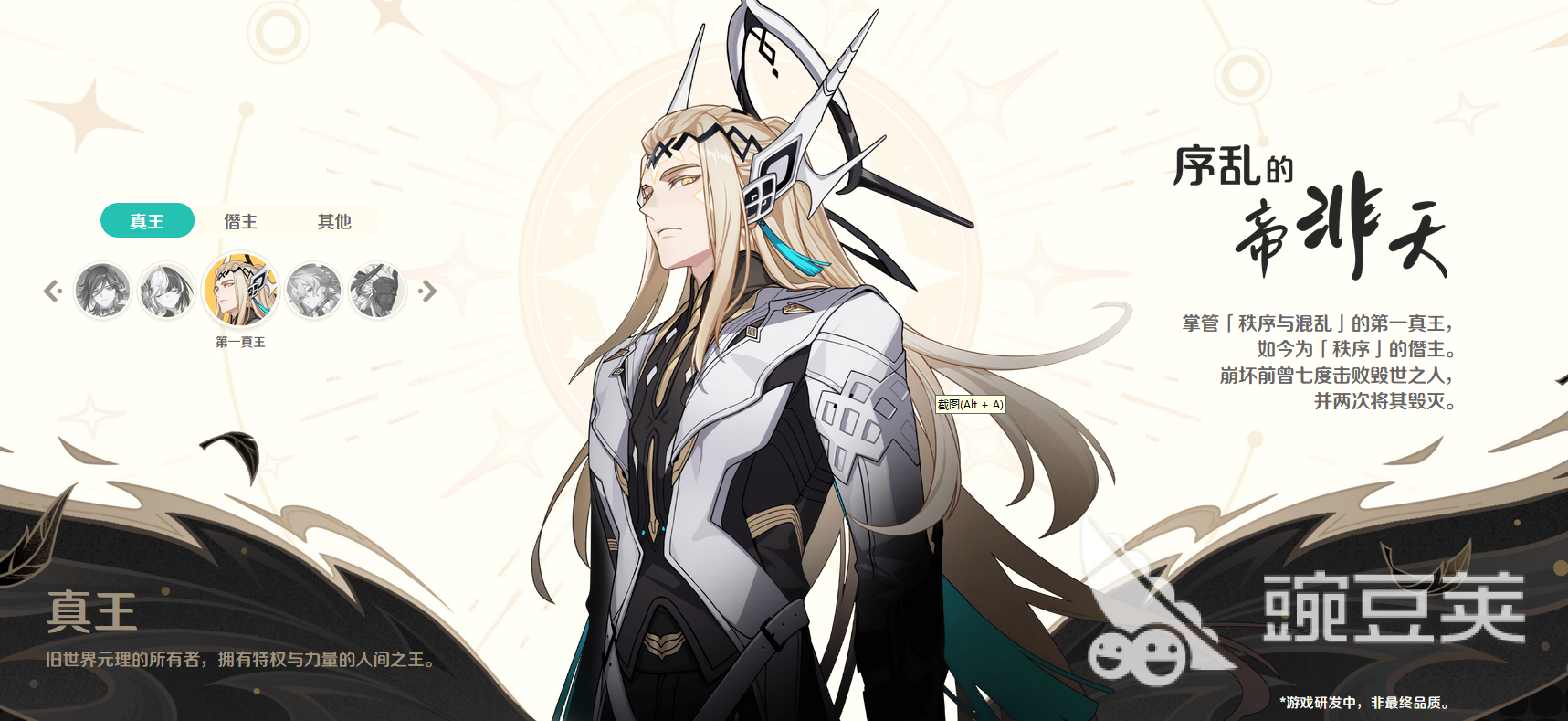 除了第十一真王之外,游戏中还公布了其他的一些真王角色,例如帝非天,九明镜,阿姆斯泰达特等。这些真王角色在世界崩坏之后,权柄出现了分裂和遗失,他们只来得及保留其中一个权柄,所以降低成为了僭主。这也是为何新世界的僭主主要由旧世界的真王直接继承力量而来。