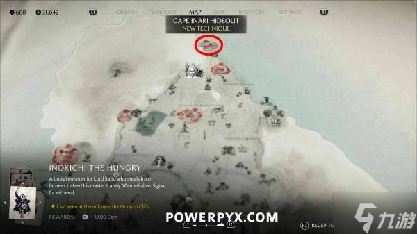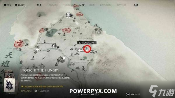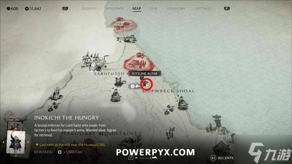 位于敌人营地的静思祭坛前,此为隐藏的敌人营地,需要前往地图最北边的【稻荷岬神社】(地图上标记位置)才能进入。抵达后可发现一道上锁的大门,需要点亮两盏带有三叉戟图标的狐狸灯笼。先穿过大门右侧带有蓝色标记的岩缝,进入洞穴房间后右转拿取火把,点燃洞内的狐狸雕像。返回室外,再穿过大门左侧岩缝,点燃里面带三叉戟图标的狐狸灯笼。