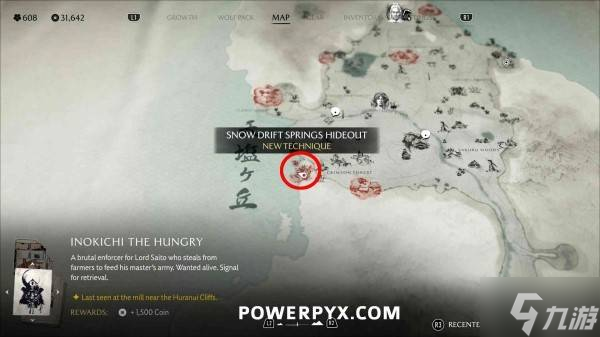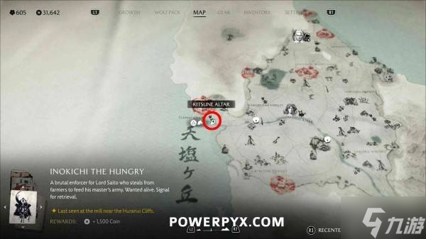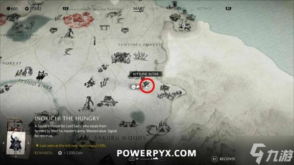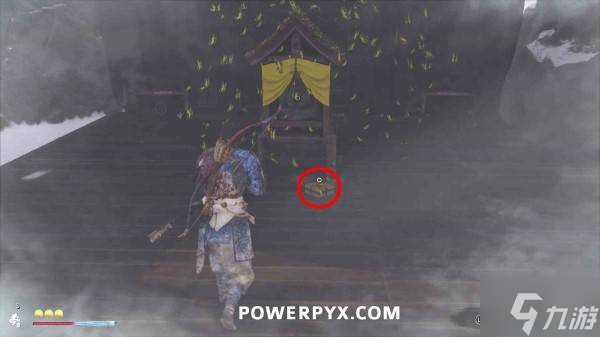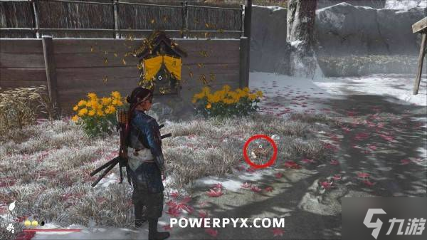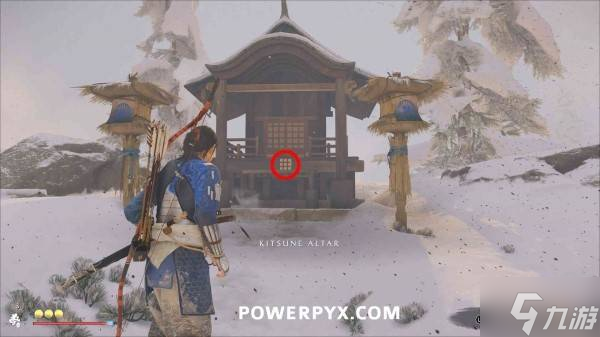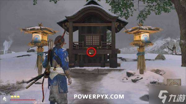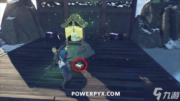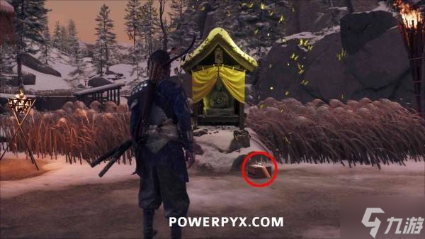 位于敌人营地的静思祭坛前,此处为隐藏营地,需要通过红叶森林的雪飘温泉神社(地图标记位置)进入。先解开狐狸雕像谜题(火把点燃正确的狐狸雕像,参考灯笼后方小岛上的狐狸石像提示):首先从大门前的火盆取得火把。面向大门时,左右两侧各有3个狐狸雕像。左侧需点燃最左边的雕像(坐姿端正、口中衔棍的那只),右侧需点燃最右边的雕像(仰面朝天、口中衔棍的那只)。第三组雕像位于大门正对面,需要攀上岩壁才能到达,在那里点燃中间那个坐姿雕像即可。