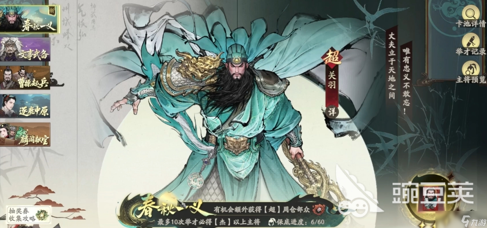 武将常驻池也被很多人成为大卡池,它里边的武将平分抽取概率,同时也有60抽保底出超品的机制,但并没有大保底说法,每次抽出的超品武将都会随机从大卡池中的武将里随机进行选择,没办法进行指定,因此能抽出什么武将都较为看运气。所以,只建议各位在需要某位武将与限定进行武将搭配时,才推荐各位将资源投入到常驻池,并且在抽取时最好不要上头,也不要投入太多的成本,若两出两个超品都不是自己想要的武将时,最好立刻就收手不再抽取。