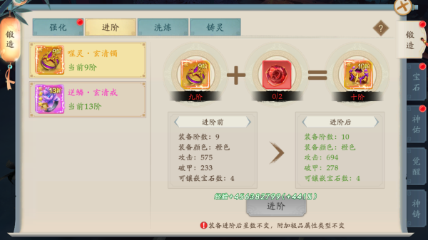 装备进阶后星数、品质不变,附加极品属性类型不变;