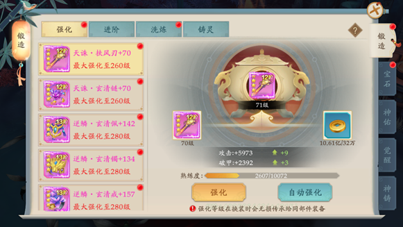 强化等级越高,消耗铜钱越多;铜钱主要通过赏金任务和天帝宝藏获得。