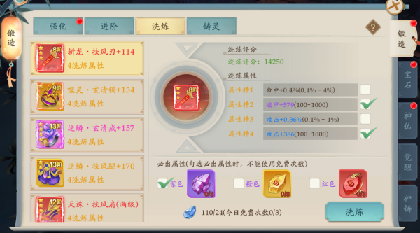 洗炼属性按品质由低到高分为:白、蓝、紫、橙、红五种,品质越高属性值越高;