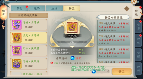 已解锁的部位可以消耗灵晶进行铸灵提升属性(灵晶在铸灵副本中获得)