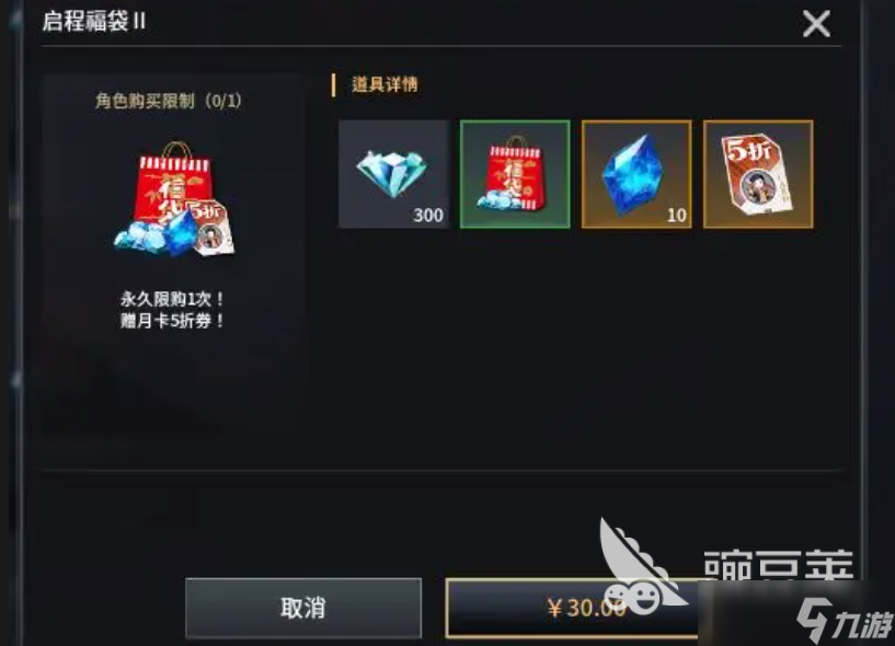 假如玩家想要通过购买月卡的方式获得角色的皮肤,那就可以选择先在游戏里购买启程福袋,使用这个福袋之后可以获得月卡5折券,这样玩家开几个卡的时候能花费的资金更少,同时启程福袋里还会有很多钻石和宝石,玩家也能通过这种方式获得一些较为基础的资源,启程福袋需要30元才能购买,大家可以根据自己的需求,选择如何进行氪金。