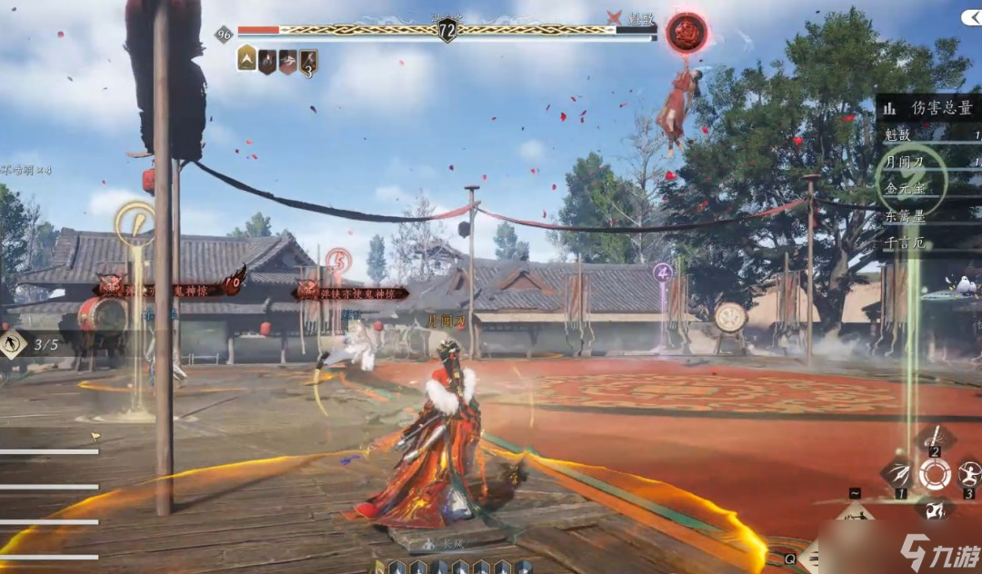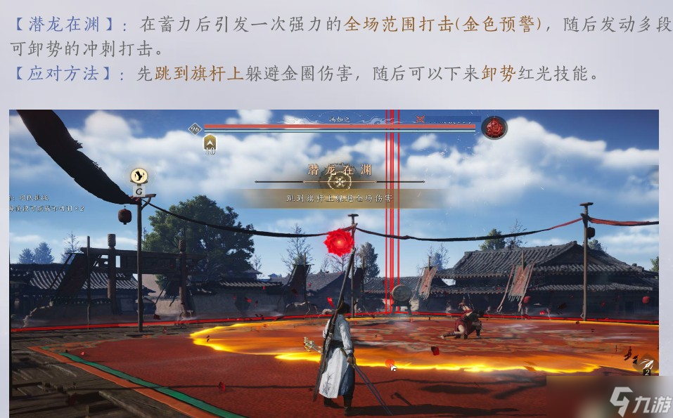 所以绣球一定要及时捡,除了T之外,还要安排一名输出(或者想要完成天赋的队友),在T来不及捡的时候去捡!玩家卸势会削减BOSS护盾值,所有玩家一定在BOSS进入暴怒状态后及时卸势,不然时间到了护盾没消失,BOSS会释放AOE团灭金光技能“潜龙在渊”,这个团灭技能可以按凌云踏跳到杆子上躲避。