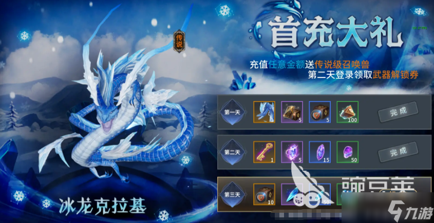 冰龙克拉基召唤兽浑身裹着凛冽寒气,看着就像冰雪世界里的主宰,身形特别庞大,展开双翼几乎能遮住半边天,鳞片是冰晶质感的,阳光照上去会泛着幽冷的光,每次扇动翅膀都能带起细碎的冰碴和冷风,它的技能以冰系攻击为主,能对敌人造成范围伤害,还会附带冰冻效果,把敌人困住没法行动,不管是打团战还是挑战高难度副本,都能帮着控制敌方,给队友创造输出的机会。玩家参与首充活动就能唤醒它,一般首充活动会设置三重奖励,它就是其中最核心的那一个,只要按活动要求完成首次充值,就能让这头冰龙跟着自己冒险。