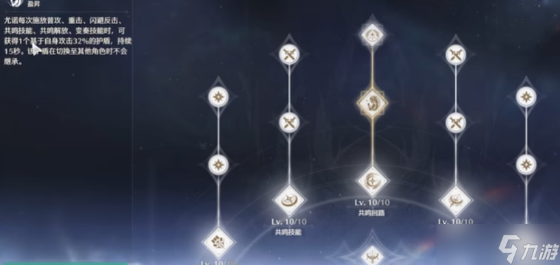 尤诺不处于月相流转状态时普攻第三段、变奏技能或者释放常态的共鸣技能时,共鸣技能会替会变成告终的喧响,释放后就能进入月相流转,同时回复二十五点灵性。灵性就是回路能量,处于该状态时尤诺会坐在自己的武器上,可以飘在空中。