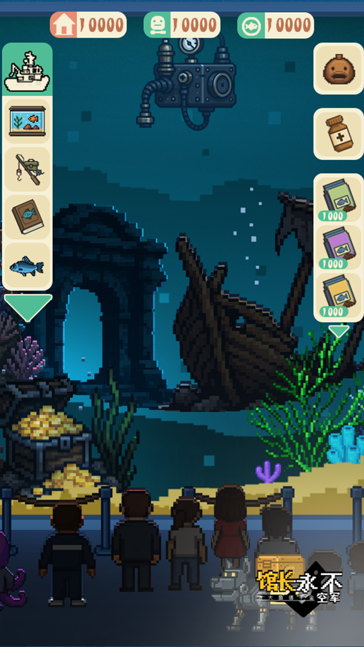 《馆长永不空军》是一款钓鱼休闲养成、模拟经营展馆的游戏。玩家可以通过在不同的海域捕捞种类丰富、品质不同的鱼,并放入自己的海洋展览馆中,以此来赚取金币。·丰富的海域及鱼类本游戏中有6个不同的海域以及50多种不同外观、品种、品质的海鱼!·永远不会空军本游戏中,钓鱼可是永远不会空军的!不过,你可不知道一竿子下去能够获得什么品质的鱼,来试试你的运气如何吧!一发入魂还是以量致胜?你能否钓到传说中的鱼?·自定义展览馆玩家可以在游戏中购买展览馆的各种装饰品,并根据自己的喜好编辑展览馆的外观哦~你的展览馆越美观,金币收益和客人就会来的越多!·有趣的展馆玩法在展览馆中,玩家要随时注意鱼的饥饿情况、小心鱼是否生病;从而需要定期的喂食喂药,以及清理粪便等操作维护海缸——这些都关乎到你的收益。玩家可以通过升级不同的设施,来提高海缸的各种水平,机械狗、机械鱼等智能伙伴可以让你便捷的维护海缸!·独特的功德值累加你可以通过放生鱼或者敲击奇怪的木鱼来获取特殊的功德值,功德值可以购买特殊的道具,帮助你获取传说中的鱼!·奇怪的彩蛋客人当你的展馆美观度到达一定程度时,会有奇怪的特殊客人进入展馆,他们会提供大量的金币或功德值!快来试试你的运气,钓起传说中的鱼,并经营你的海洋展馆吧!