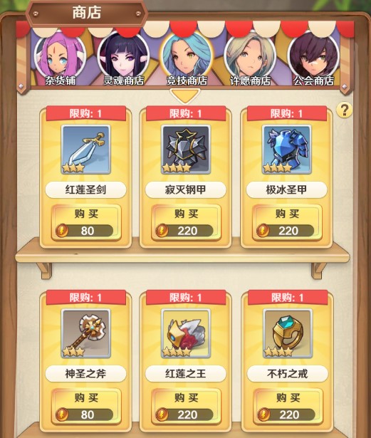 在商店中可以利用各种资源兑换装备,其中竞技商店刷新的高等级装备最多,但同时也需要较多竞技场币进行兑换(竞技场排名越高,所能获得的竞技场币越多,所以好好提升自己的排名吧!)