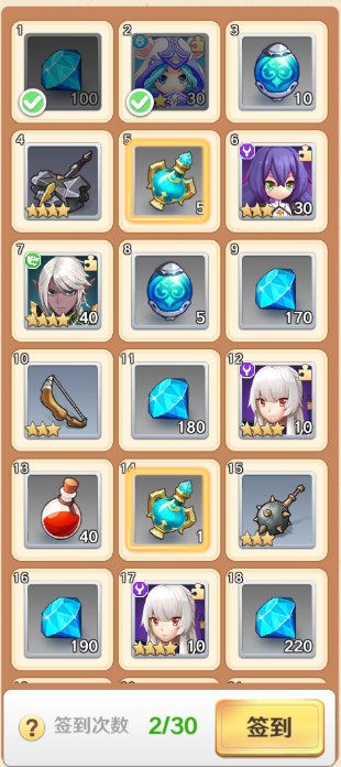 每日签到中除了会产出钻石和英雄碎片之外还有许多武器装备,每天动动小手就能获得,记得一定要签到哦~