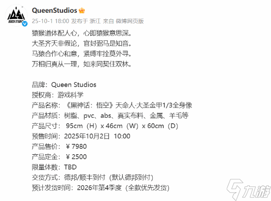 此前报道,QueenStudios官方公布了由游戏科学官方授权的《黑神话:悟空》天命人·大圣金甲1/1全身像,该全身像售价为99800元,限量体数99体,尺寸为272cm(H)x 180cm(W)x 131cm(D),预售时间为2025年10月2日10:00,预计发货时间为2026年第4季度(全款优先发货)。