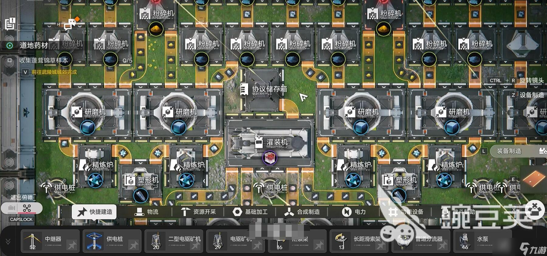其实工厂由协议核心、生产线模块及电力系统这三大部分来组成的,其中的协议核心是中枢设施,黄色范围为供电区域,这个区域内能够建造精炼炉、粉碎机等设备。我们在最开始的时候解锁蓝图后,优先建造两条基础产线。首先就是推荐大家紫金矿→精炼炉→塑型机→灌装机(生产零件),种植机→粉碎机→罐装机(生产药品)。传送带的话其实是非常复杂的,这里就只介绍一下入门玩法就不太细说。但是基础上还是树形分布,有干线有分支,干线走原材料,越到后面的工序就越支线。主线带宽大于支线这样会避免材料堵路,精炼炉输出端连接3条传送带时,每条效率降至33%,建议重要物资单独走线。