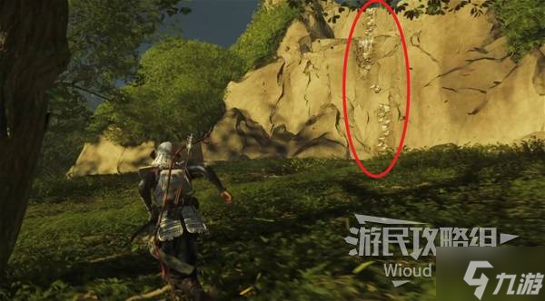 来到目的地,发现祭坛在独立的石柱上,注意石柱旁边的高地,贴着高地底部边缘走,有个可以往上爬的节点。