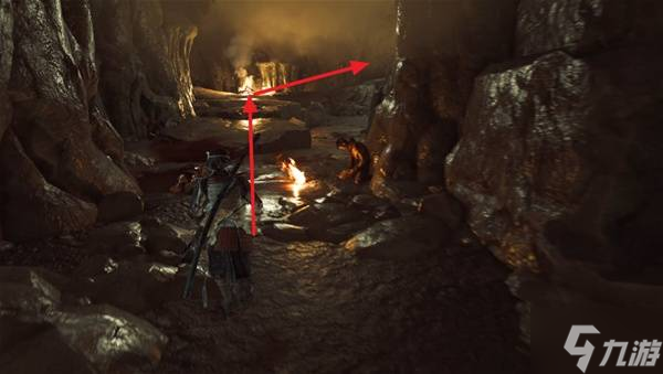 沿着里面的坡道走,打开坡道拐角的宝箱,走不远可以看到墙上的攀附点,直接爬上去。