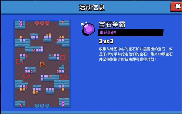 迪克在0-400奖杯的竞技场中适合3v3团队作战,方框区域为迪克优势时的攻击站位,红圈区域为劣势时攻击站位,中场区域为均势时迪克的普通攻击埋伏区。