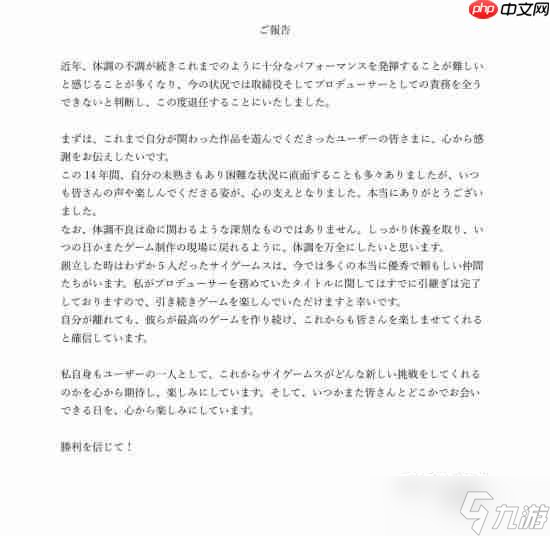 在声明中,他坦言近年来身体状况持续欠佳,难以维持高强度的工作节奏,经过慎重考虑后决定暂时退出一线岗位。他向一直以来支持自己与Cygames的玩家群体、共事团队表达了诚挚谢意,感谢大家在过往工作中的包容与协助。