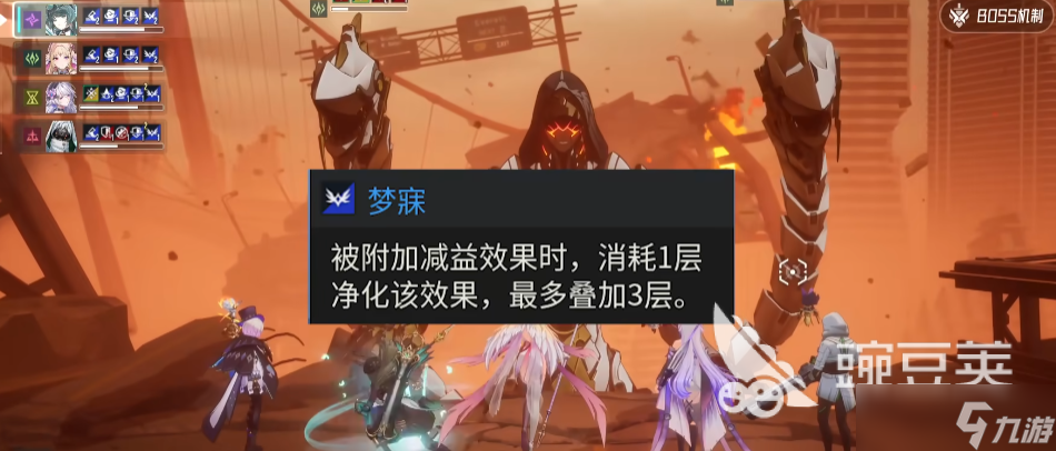 这个增益是给我方带来的效果,而减益给敌方带来的效果基本都是跟双方的行动进度有关的,而她的第二个技能叫做月梦华,月梦华这个技能是可以带来全体队友增加增益效果的,所以芙蕾雅是非常适合放在辅助增益位置上使用的一个角色,她使用玉梦华的时候可以给全体的队友来附加两个回合的增益效果,这里的增益效果体现在防御上升的数值以及梦寐的效果上面,且在同时还有80%的几率可以额外附加一层的梦寐,再给自己的队友增加增益。