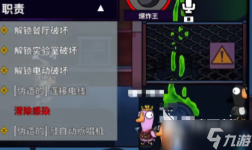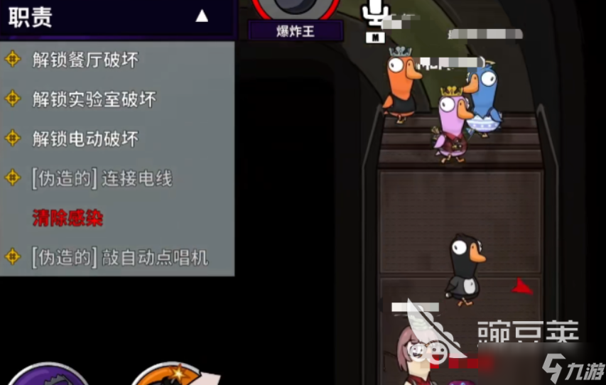 爆炸王这个角色属于鸭子阵营,他的技能为放置炸弹,一旦敌人踩到这些炸弹就会受到伤害甚至被炸死,而且既不会触发警报,也不会触发身份查验,不仅隐蔽性极高,战斗力也是非常强的,如果说你的队伍中需要一个可以制造混乱的角色,那么爆炸王绝对是最佳选择。当然了,这个角色也有一个缺点,那就是不能直接刀人,放置炸弹是他唯一的杀人方式。并且你所放置的炸弹带有传递效果,如果说对方触碰到了炸弹,那么将会在头上出现一个15秒的倒计时,在这15秒之内炸弹是可以交接给其他玩家的,但不会重新计时。
