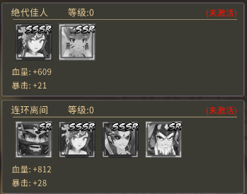 在羁绊方面,可以说是非常难凑齐,因为首先第二层的羁绊需要吕布!这个是高级VIP才有的,当然也可以通过部分活动获得,而第一层的祝融比较容易获得,不算太难。