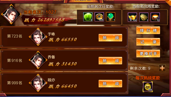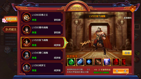 3. 名将讨伐,可以获得大量装备,以及其他道具资源。需要注意的有,每天击杀boss的次数只有3次,是所有boss击杀次数的总和。还有自己等级超过boss100级以上不会获得boss奖励。卧虎藏龙里面的boss是随便杀的没有次数限制,自己等级高于boss100级以上没有奖励获得。