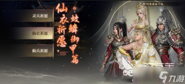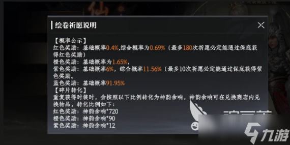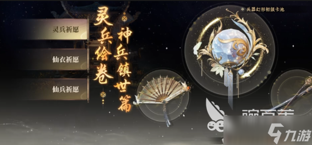 先来看一下抽卡的分类总共是三种,分别是灵兵、仙衣、仙兵祈愿,不一样的祈愿所对应的奖励会有所区别。灵兵祈愿能出武器,仙衣祈愿是时装,仙兵祈愿是一些比较厉害的武器,如果你想要炫酷的武器,那就可以看一下灵兵还有仙兵。而如果你想要的是时装,那自然就不应该错过仙衣祈愿。接着可以看一下概率的问题,红色奖励的概率只有0.4%,综合只有0.9%,但是180次的话肯定就会出。橙色的基础是1.65%,紫色的基础是6%,蓝色的概率相对比较高,就会达到91.95%。