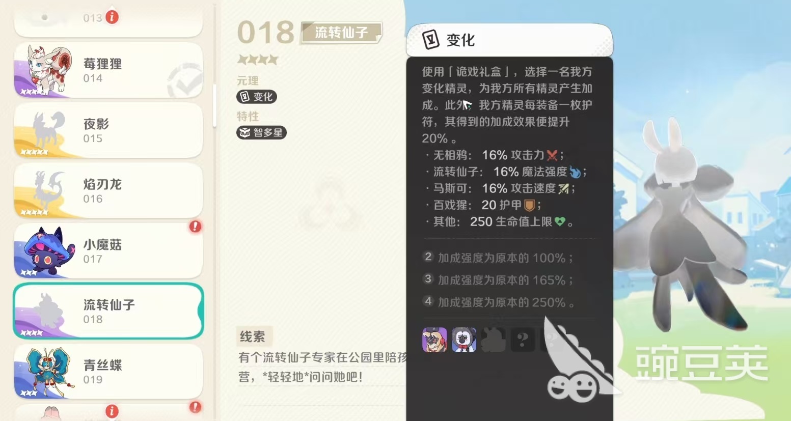 变化这个原理效果是能够使用诡计礼盒,选择一个我方变化精灵,为我方所有的精灵都产生加成,另外我方精灵每装备一枚护符,其得到的加成效果便能够提升20%。这里注意护符指的是大家选择不同心像之后带来的不同加成,这和心像的选择。目前所有具有变化原理的精灵主要包括无相鸦、流转仙子、马斯可、百戏猩这几个。其中无相鸦的额外作用是16%的攻击力加成,流转仙子带来的是16%魔法强度加成,马斯可是16%攻击速度加成,百戏猩是20点护甲值。这几个精灵就可以同时出战,这样就能够获得较强的羁绊效果,只需要4羁绊就能够使加成强度变为原本的250%,既容易达成,这些精灵的强度又比较高,很适合大家去选择。