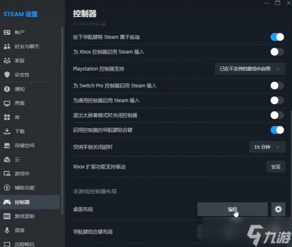 您还可以在“桌面布局”右侧点击“编辑”,进入“编辑布局”界面,为手柄自定义按键功能。