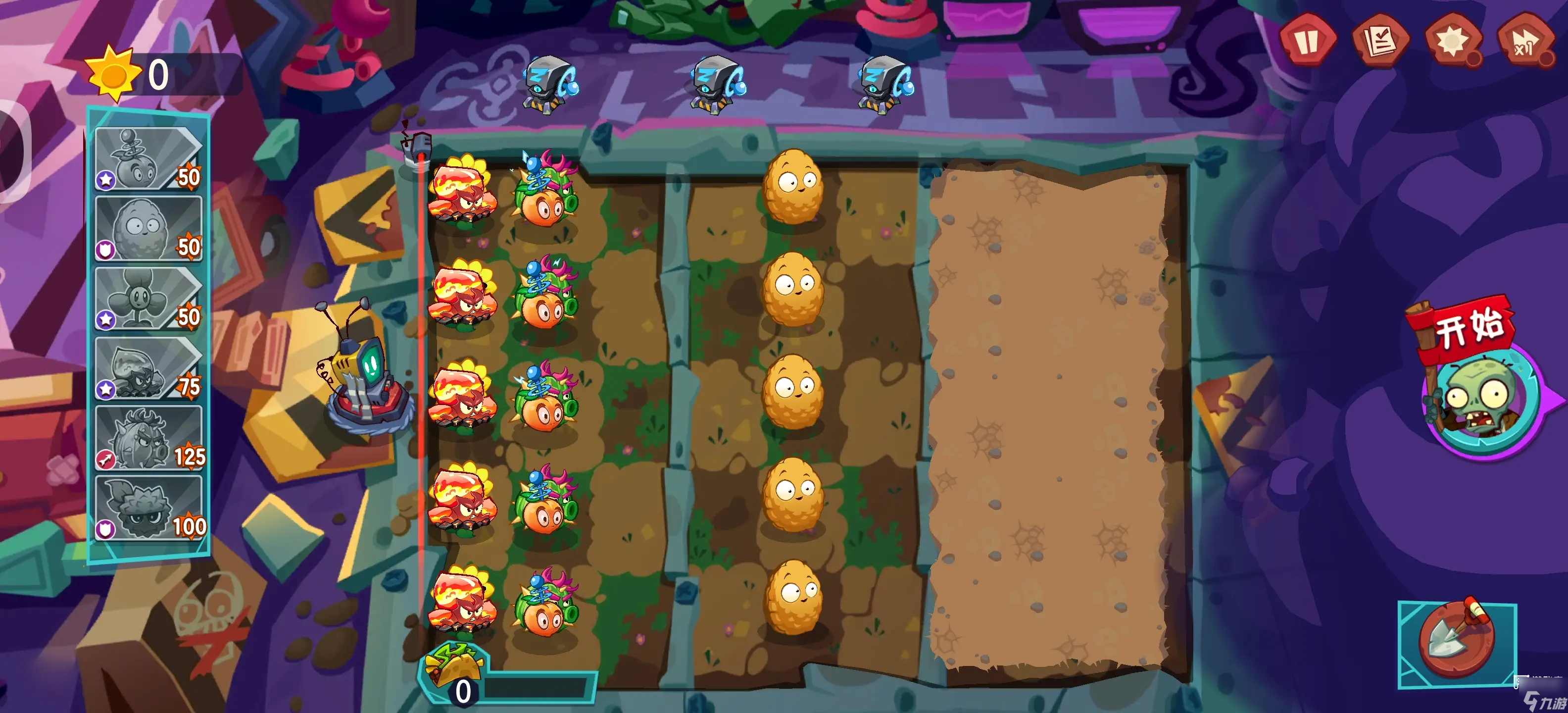 3、阵容摆放,前期先给后排仙人掌附魔火属性然后仙人掌附魔电属性,第五排放坚果不用管,这里要注意一定第五排放坚果,其余的地方啥也不要放,一局结束也不要放别的地方。