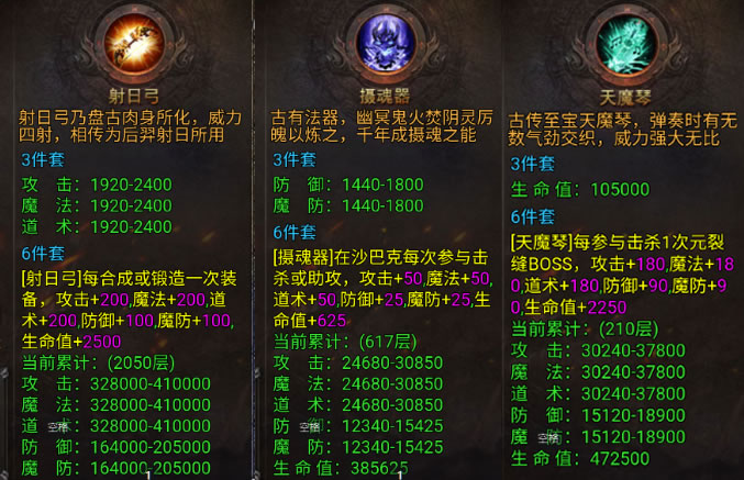 每层加成:攻击+200, 魔法+200, 道术+200, 防御+100, 魔防+100, 生命值+2500