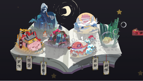 首先,游戏的画风是非常有个性的武侠风,略显怪奇创意!整个游戏玩起来给我的感觉就是“想要去河南嵩山 学少林跟武当”,但是不同于大多数武侠手游,这款游戏的美术是非常有特点的,人物的造型是中国传统的泥人和水彩手绘国风,而游戏的江湖地图是各大造型奇怪的门派坐落在一本书上面的,非常有想象力,游戏画风对得起独立游戏这四个字,给开发组点赞,真的希望有更多的传统文化融入到国产游戏中来。