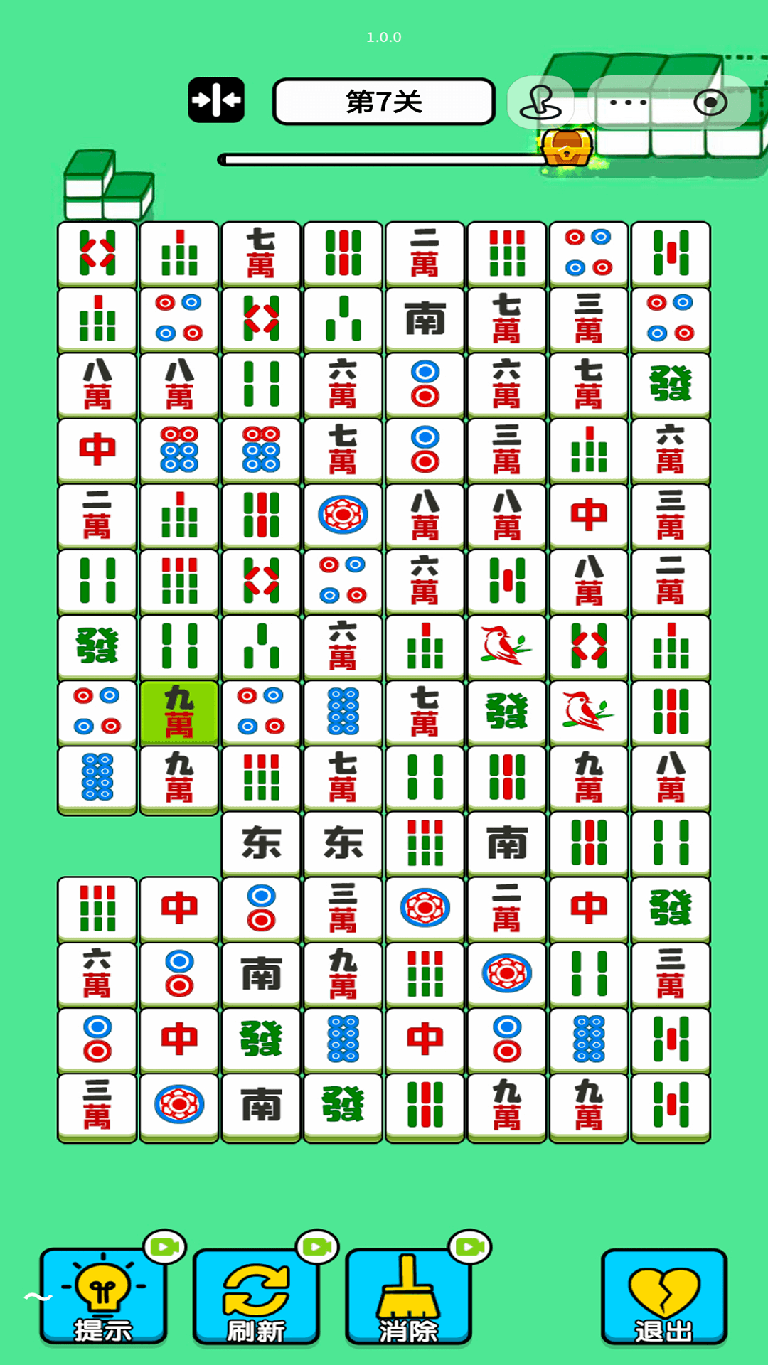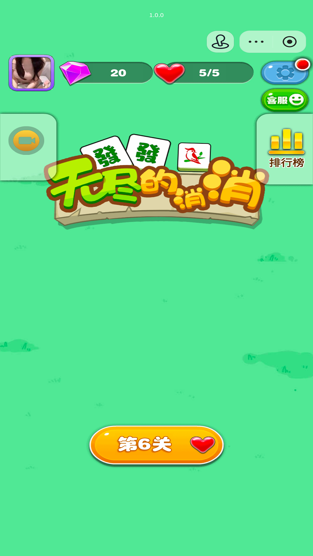 无尽的消消是一款经典益智连连消小游戏。游戏类型是消除类 游戏的主要目标是消除屏幕上的所有麻将牌,玩家需要找出相同图案的麻将牌并消除它们。 消除规则:相邻的图案相同的麻将牌可以直接点击消除。 点击某一块麻将牌A,只要连线拐角不超过2个的图案相同的麻将牌B,则A和B可以一同消除。注意,A和B必须是两张相同的麻将,不管是花色还是样式都要匹配。 道具使用:游戏中提供了多种道具来帮助玩家消除麻将牌,如提示道具、刷新道具和消除道具等。 提示道具可以告诉玩家目前可以相连的牌。 刷新道具可以打乱麻将牌面,使玩家从新的局面开始游戏。 消除道具可以随机消除2个麻将牌。