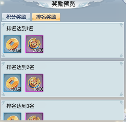 每日排行奖励:排名越高获得铜币和荣誉积分奖励就越多,每天22点通过邮件发放奖励;