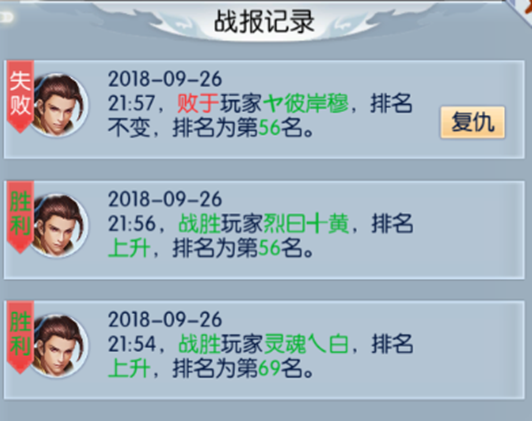 战报:挑战或被挑战都会有记录产生,当自己挑战或被挑战失败时,会有复仇按钮,方便玩家对其进行反击,复仇也会消耗挑战次数