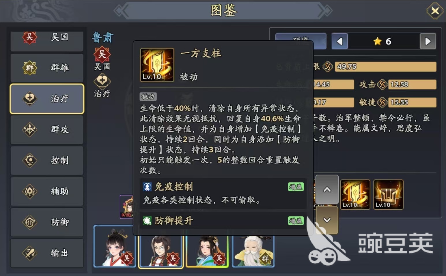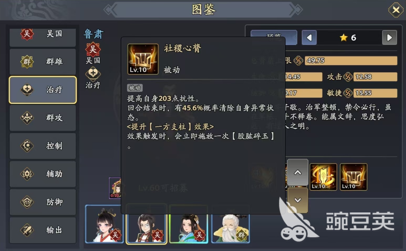 这个被动的触发也很有特点,初始只能触发一次,后续凡是5的整数回合都会重置触发次数,所以即使战斗的回合数比较长,鲁肃的被动依然有发挥的空间。主动技能效果是伤害敌方前排目标,按照敌方的生命上限来附加伤害,同时恢复少量生命值,还有几率对目标造成流血状态,使对方降低攻击力,降低受到治疗的效果,还能额外掉血。必杀技是对己方全体目标释放,恢复生命值并添加防御提升状态,持续三回合。如果当前目标处于异常状态,受到的治疗量提升,且能够将异常状态驱散。