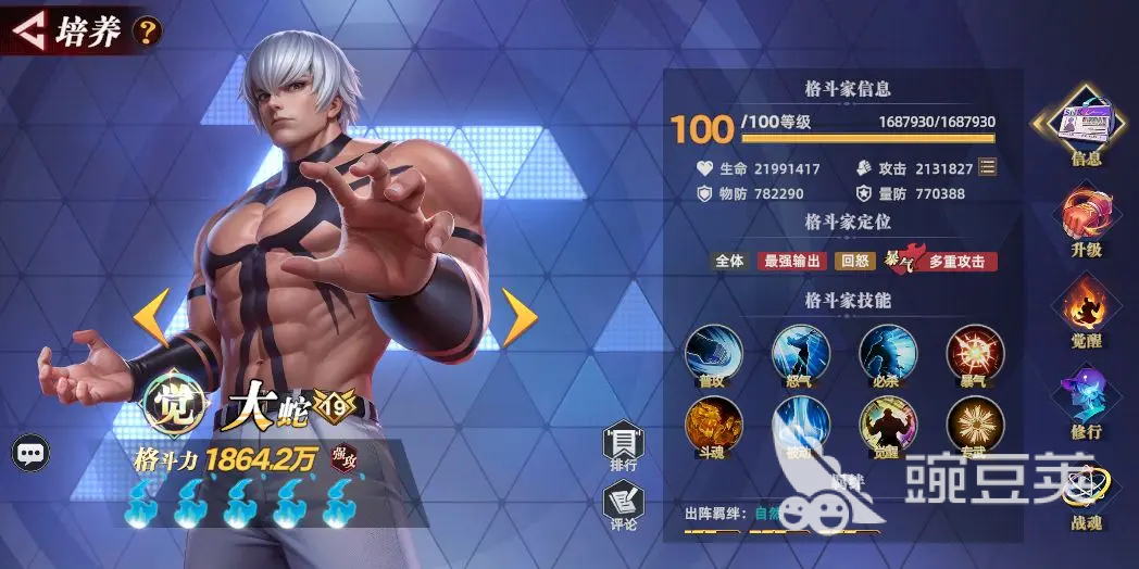 大蛇在强攻角色中也比较受到喜爱。输出曝气可净化自身负面效果,直接拿到2次重拳出击的机会,还可恢复杀气。直接免疫控制效果,功能比较全面。必杀和怒气都比较好用,怒气技可额外打造领域,在领域加持下,全体伙伴都能得到大幅度加强,不仅输出力度在线,对友方的助益作用也非常显著。