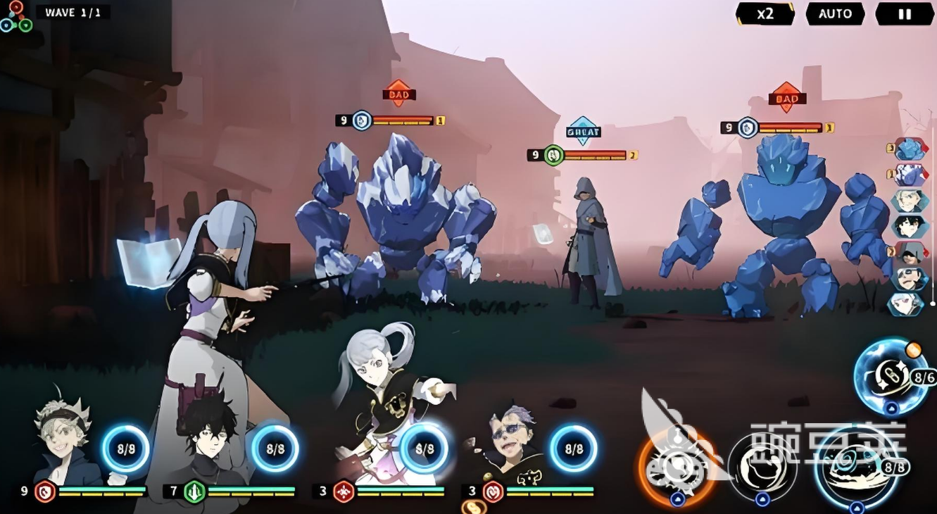 游戏的对战过程中会有多个WAVE组成,击倒wave标记的敌人后会转移到下一个目标进行标记,直到玩家击倒全部的WAVE敌人后才会判定对战胜利。游戏的攻击方式以回合制的方式呈现,玩家只要选择好阵容角色后即可开始战斗。每回合的出阵角色以行动顺序为准,在界面右侧可看到每回合顺序的行动条。