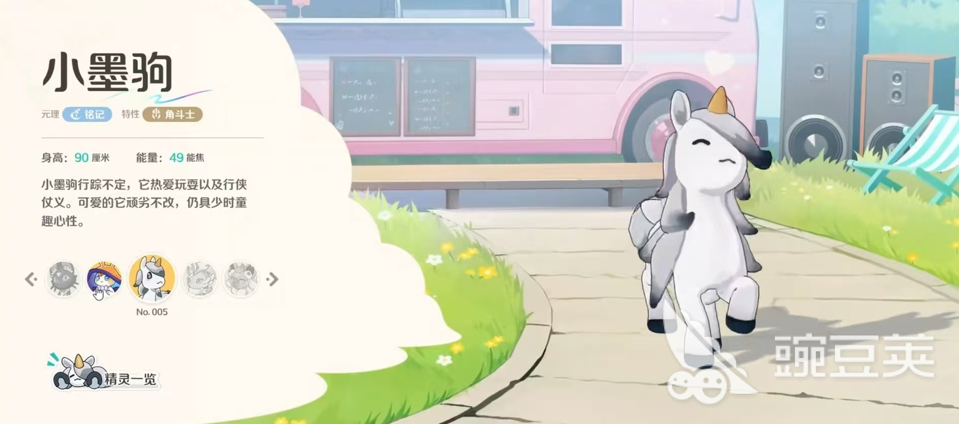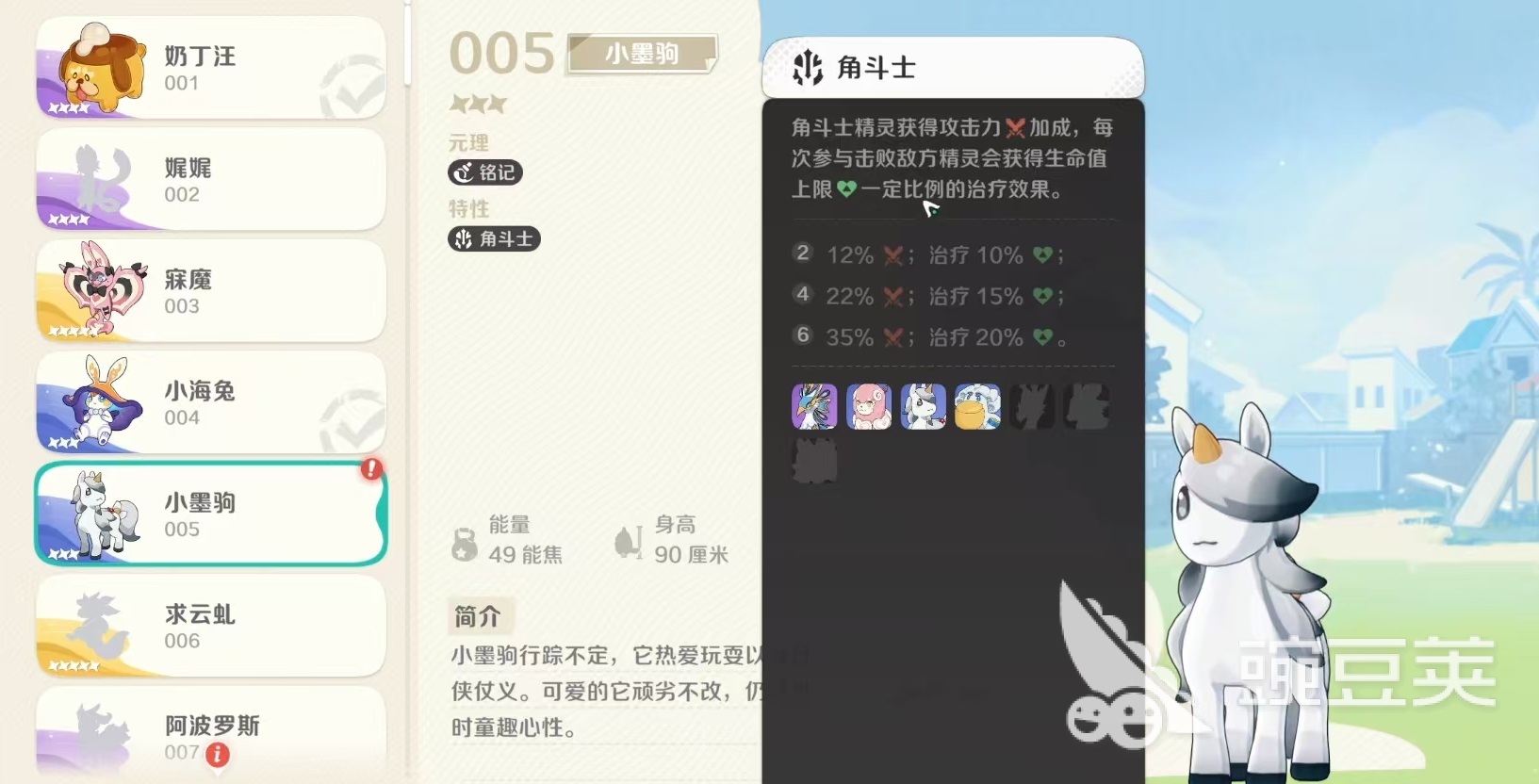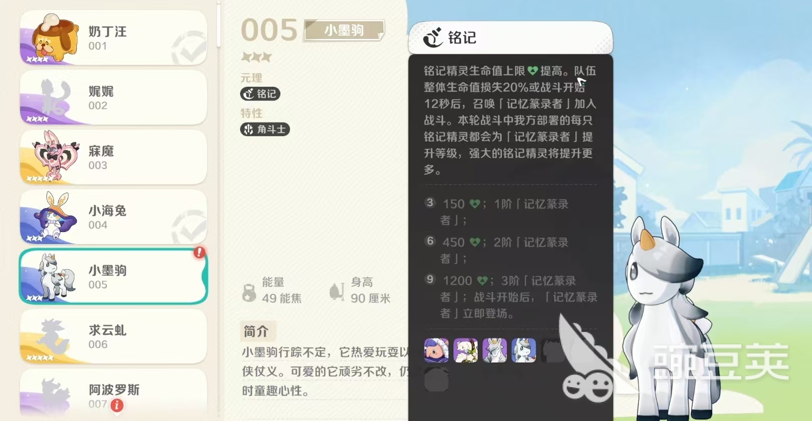 小墨驹因为自身行踪飘忽不定,所以有些神秘,他热爱玩耍以及行侠仗义,具有少时童趣心理,身高90厘米,能量49能焦。它的元理是铭记,特性为角斗士。在元理方面,它的特点是所有带有铭记的精灵,生命上限都能提升队伍,整体生命值损失20%或者是在战斗开始12秒后,召唤出记忆篆录者加入战斗,本轮战斗中我方部署的每一只铭记精灵,都可以给召唤出来的记忆篆录者提升等级,强大的铭记精灵将提升的更快。