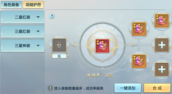 上仙们可以通过消耗本职业多余的同阶二星橙装来合成同阶的二星红装,而三星红装则需要使用二星红装来合成。最低可以用三个装备进行合成,成功率为70%,五个装备作为材料时必定成功。