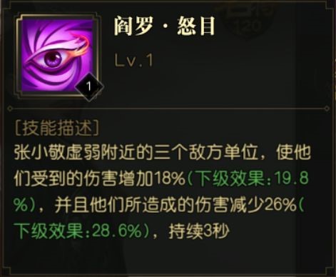 首先是张小敬的大招:阎罗·怒目,群体双效果减益技能,即使敌方英雄造成伤害降低又使其受到伤害加深!