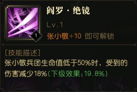 最终被动技能:阎罗·绝境当兵团生命值低于50%时, 的伤害减少,配合怒气技能的降低敌方伤害与第一个被动的减伤加成,张小敬兵团在生命值低于50%时减伤效果可以高达接近50%。