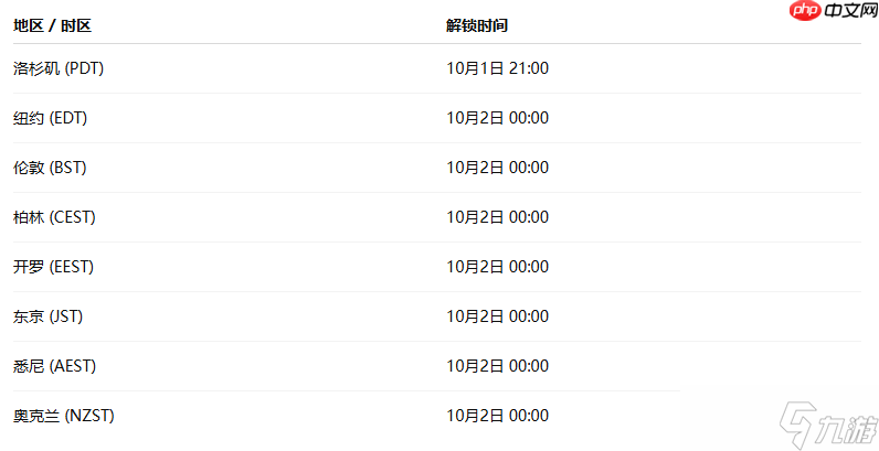 官方已确认,游戏将采用“零点同步解锁”机制,全球各地玩家可在各自时区的10月2日0:00起进入游戏。受时差影响,部分区域的实际可玩时间将略有提前。以下是主要地区的具体解锁时刻: