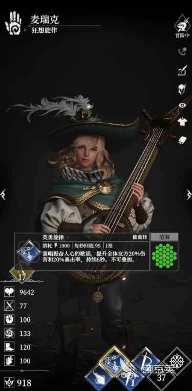 狂想旋律的“共鸣”能在身上每有1个增益技的情况下,让伤害提升15%最多提升60%,他的“咒骂”会在战斗中首次生命低于50%时触发,此时会咒骂周围2格的敌人们,使得他们陷入到沉默之中,在10秒内无法释放能量技,并且每秒失去100点能量,他的“强音”会对目标造成敏捷58%加攻击58%的物理输出,他的能量技可以让所有队友的伤害以及暴击率,在6秒内提升20%。