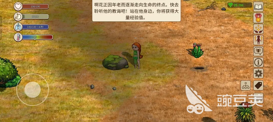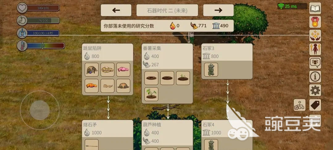 工具制作,也要先从简单的开始,先打造一些简易的物品,后续解锁了高级工具,再去制作。草碗可以盛放食物,这是前期维持生存必备工具。当然角色也是有生存数值的,要时刻关注角色状态,比如生命值,饥饿值之类的,饥饿就需要吃东西,受伤要使用草药回复。前期减益选择新手部落,这里难度会低一些,还能和其他玩家交流学习。