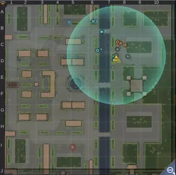 喷泉和铁塔均在E纬度线内。红色标点为我军集结地,蓝色标点为敌军集结地。