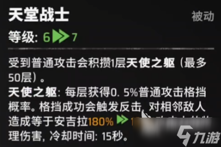 首先第一个天赋效果叫做天堂战士,技能可以用来打反击,这个技能在受到对面普通攻击的话会让安吉拉自己再积攒1层天使之躯吗,这个效果是最多可以积攒50层的,而天使之躯的效果就是每拥有一层的时候,可以获得0.5%数值的普通攻击格挡概率,这里格挡成功的话还会触发反击的效果,而对相邻敌人的话,还可以造成一次跟安吉拉180%数值一样的输出,而这里是可以造成192%攻击力的物理伤害,这个技能手速秒冷却比较长。