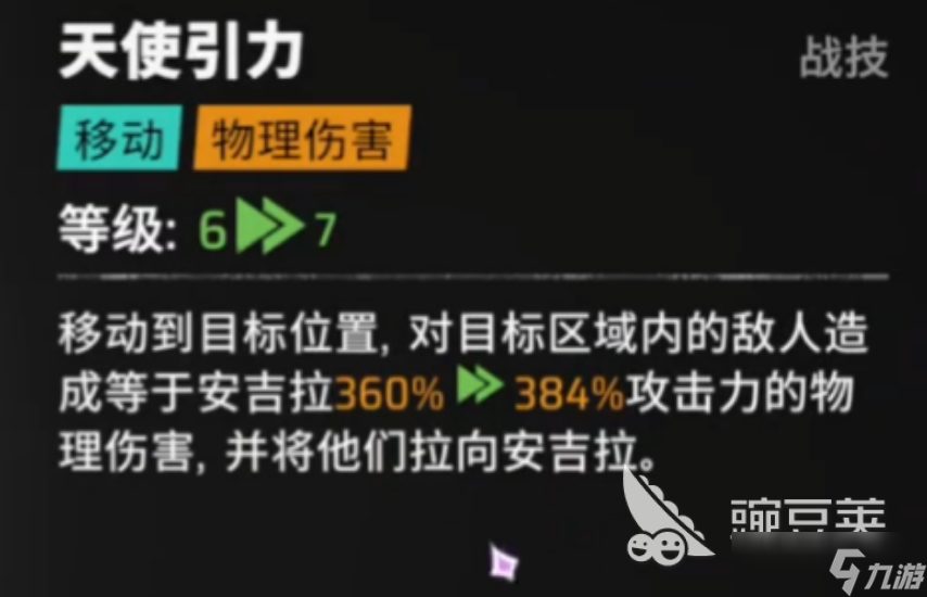 她的战技叫做天使引力,是一个大范围的伤害牵引技能,可以把怪拉到自己身边,有什么用呢,就是在实战里面可以配合钢铁侠的效果用,钢铁侠的多重光炮是可以搭配上的,这样就可以更好的打出大量AOE伤害,使用的时候安吉拉会迅速移动到目标位置,然后对这个目标区域内的敌人带来等于安吉拉360%数值,也就是差不多384%攻击的物理伤害,并将这些目标再次拉向安吉拉,这天使引力的技能范围非常广,这个3×3×3的等边六边形拉过来之后,配合钢铁侠上面那个技能伤害是巨高的。