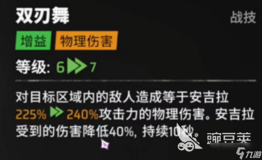 所以根据这个连招,大家就可以做好队伍搭配,前排放安吉拉,后排出钢铁侠,加上一个治疗的博士,博士大招治疗战技的治疗效果不错,可以把大家的生存效果的拉满,第二个战技叫做双刃舞,双刃舞虽然伤害上面偏低,但是效果特别强,可以对目标区域内的敌人造成等于安吉拉240%左右攻击力的物理伤害,而且这里安吉拉自身在受到的伤害数值上面也会降低40%,,效果还会持续10秒,这里降低的数值差不多一半了,这直接可以说安吉拉她的防御最强啊。